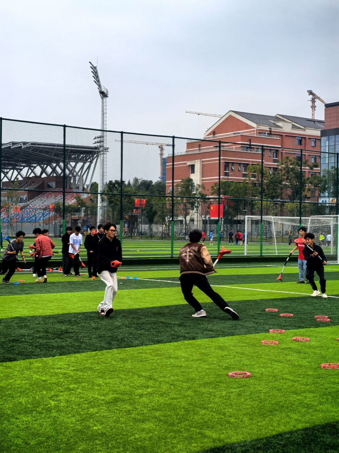 面对新奇而有趣的新项目,同学们热情高涨。在开始之前,教练为同学们详细介绍了YOU.FO飞环运动的起源,规则和技巧。教练介绍,YOU.FO创新飞环运动不仅考验着参与者的反应速度和手眼协调能力,更注重团队协作和策略运用,是一项集竞技性、娱乐性和健身效果于一体的优秀运动项目。同学们在教练的指导下,纷纷拿起特制杆,尝试接发圆环,现场充满了欢声笑语。他们不仅体验到了飞环运动的乐趣,更在团队协作中培养了默契和友谊。