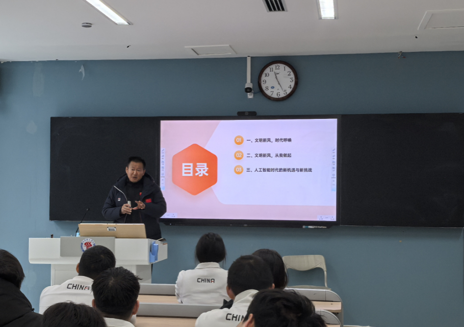 班会围绕“文明新风,时代呼唤”、“文明新风,从我做起”和“人工智能时代的新机遇与新挑战”三个方面展开,通过资料展示、案例分析等形式,对同学们日常生活中常见的行为习惯问题、安全意识问题、学习学风建设等问题进行了深入分析,并围绕“我身边的好习惯、坏习惯”、“如何培养良好行为习惯”展开热烈讨论。与会同学们积极发言,纷纷就如何培养良好行为习惯、牢牢树立安全意识、爱护校园环境从我做起等方面建言献策。