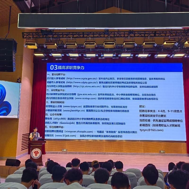 裴鑫以“从校园到职场:如何走好每一步”为主题,结合自身经历,从学业精进、技能提升到职业选择展开分享。她以体育行业的就业趋势为切入点,通过精心制作的PPT和图表,系统梳理了体育领域就业渠道、考研方向及资格认证路径,并强调“跨界能力”在职业发展中的重要性。